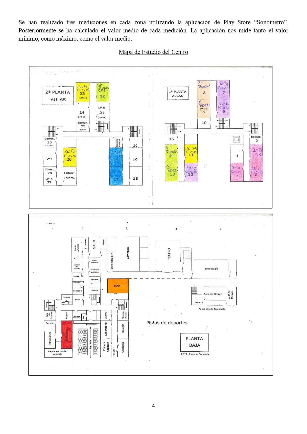 Los alumnos de Ciencias Aplicadas de 4º de la ESO han elaborado un completo proyecto sobre un estudio acústico de nuestro instituto. Utilizando la app «sonómetro» se han realizado varias mediciones en puntos clave del instituto, se han trabajado las zonas en planos a escala del centro, se han informatizado los resultados utilizando gráficas y software informático y se ha buscado información sobre las consecuencias para la salud de la exposición prolongada a altos niveles de ruido. Por último, se establecen una serie de medidas para revertir la situación y reducir dentro de lo posible los altos niveles de contaminación acústica. Gracias a todos y cada uno de ellos por su implicación y dedicación. (Os podéis descargar el proyecto al final de la página en formato pdf)